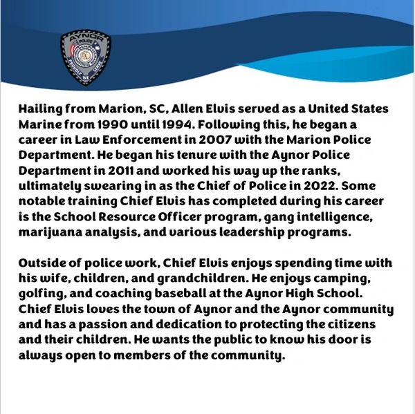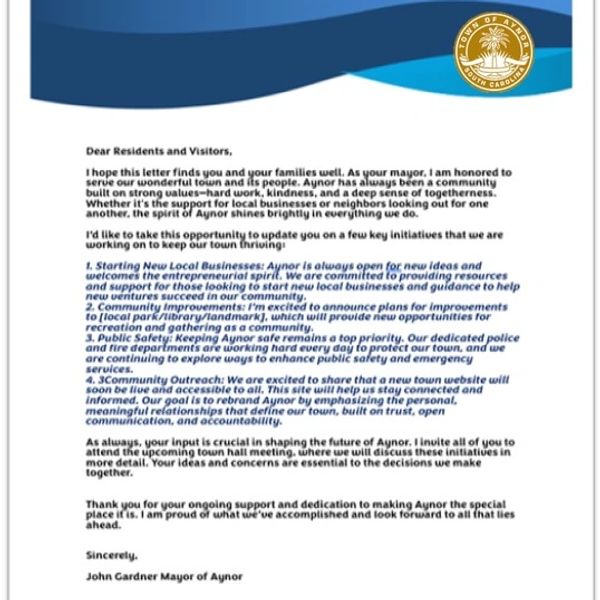 I hope this letter finds you and your families well. As your mayor, I am honored to serve our wonderful town and its people. Aynor has always been a community built on strong values—hard work, kindness, and a deep sense of togetherness. We are a resilient and caring community. Whether it's the support for local businesses or neighbors looking out for one another, the spirit of Aynor shines brightly in everything we do.